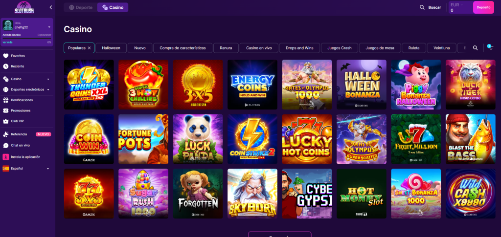 Las SlotRush tragamonedas son el plato fuerte del casino. Con unos 45 proveedores, hay variedad para todos los gustos. Desde las clásicas de frutas hasta las modernas con temáticas de series y películas.
